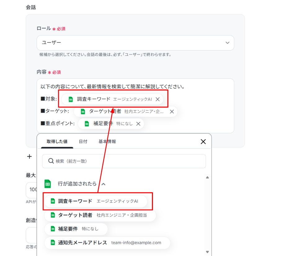 文中に「取得した値」を使用することで、都度変更することなくGoogle スプレッドシートの最新情報を反映できます。