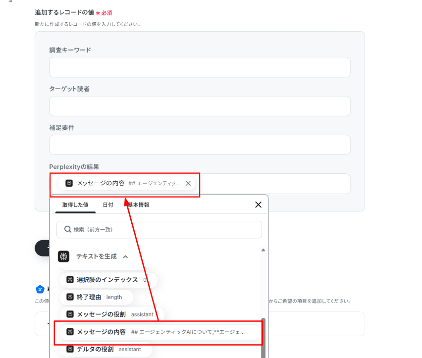 (3)「追加するレコードの値」にPerplexityで取得した「メッセージの内容」を使って入力します。 入力が終わったら「テスト」をクリックしましょう。