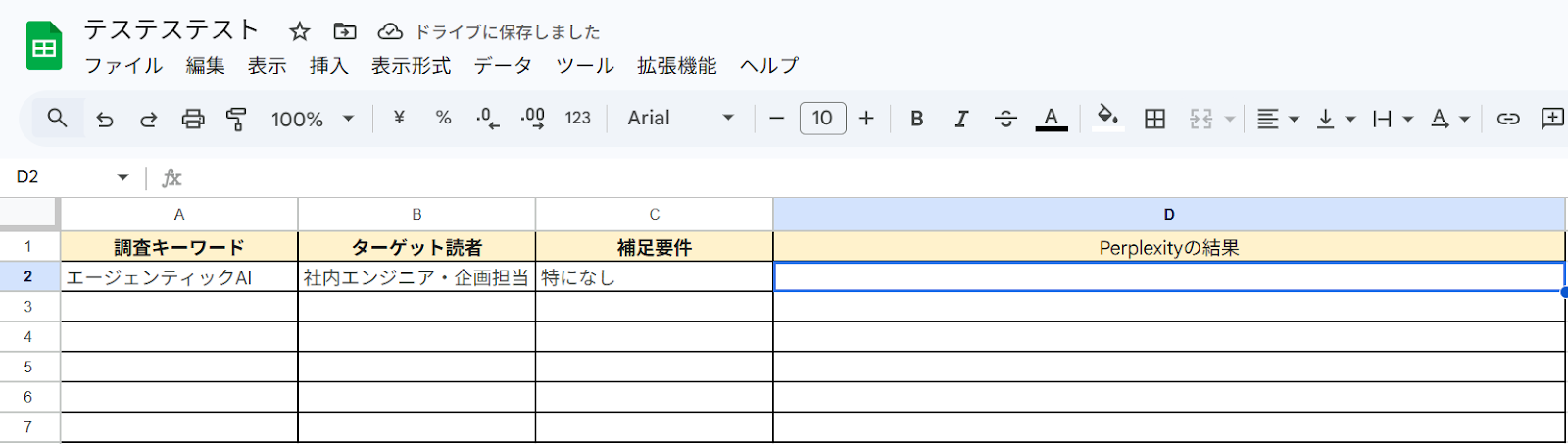 テストに成功すると、Google スプレッドシートにPerplexityで生成されたテキスト内容が反映されます! Yoomに戻って「完了」をクリックしましょう。