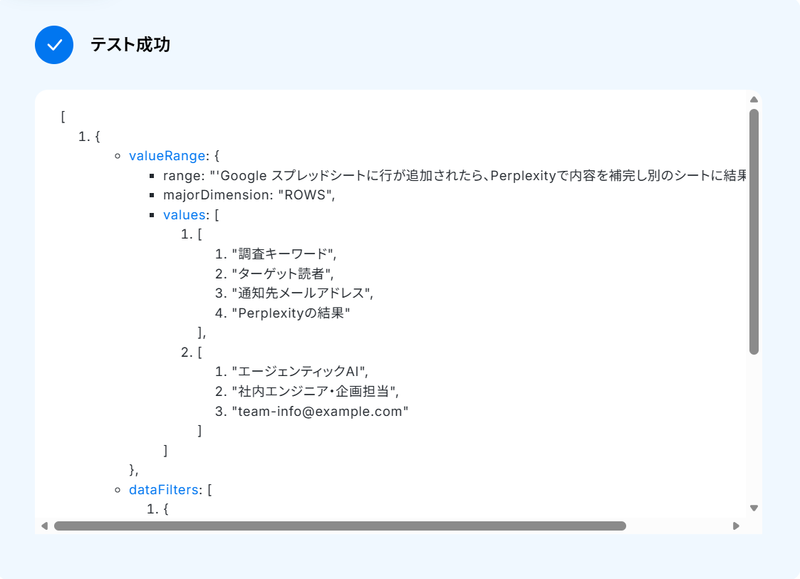 テストに成功すると「取得した値」にGoogle スプレッドシートの情報が反映されます。