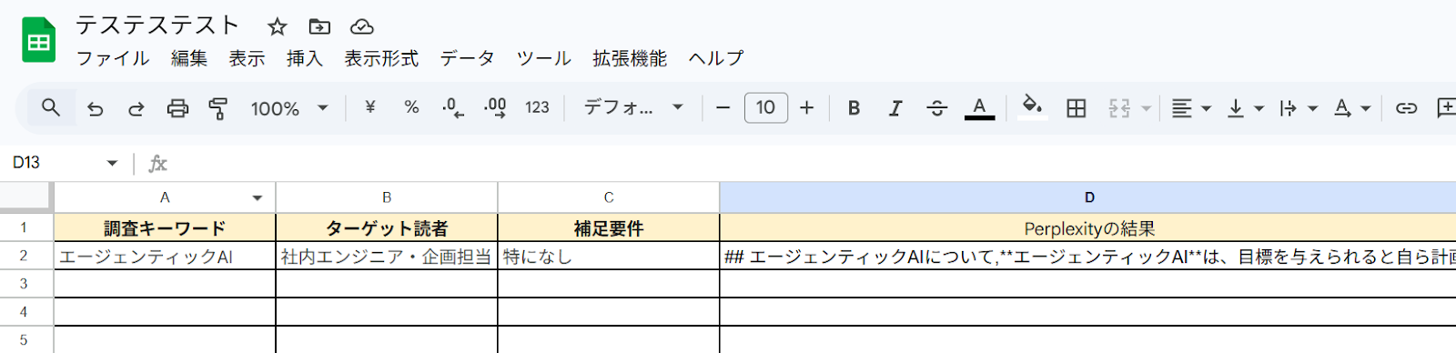 実際にフローボットを起動して、Google スプレッドシートに行が追加されたら、Perplexityで内容を補完し別のシートに結果が追加されているかを確認してみてくださいね!