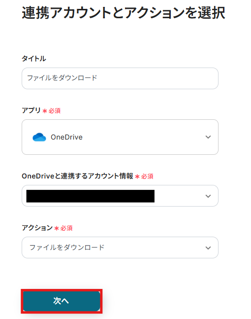 2) アクションは「ファイルをダウンロード」が選択されていることを確認して、「次へ」をクリックします。