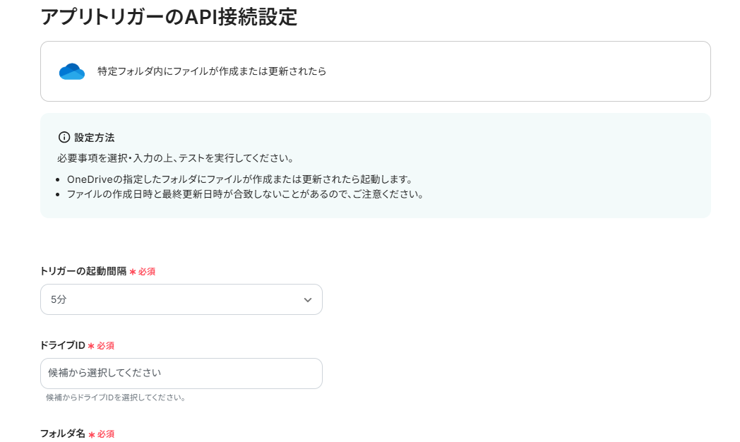3)トリガーの起動間隔を選択し、ドライブID、フォルダ名、フォルダIDを入力します。
