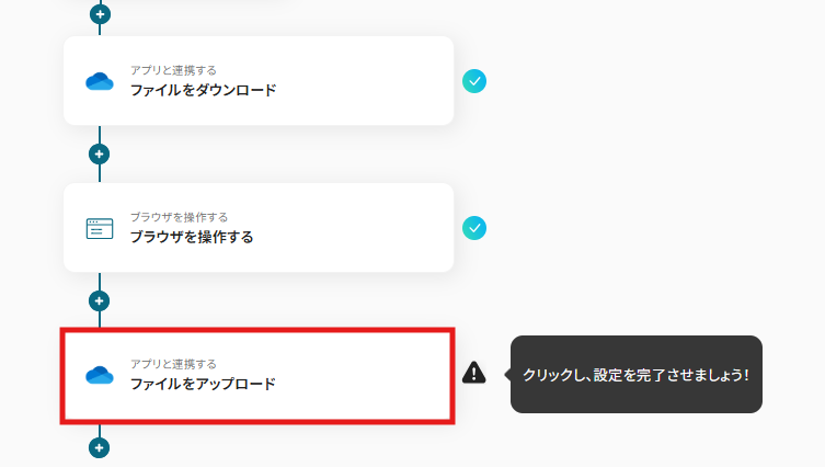 1) フローに戻り、「アプリと連携する ファイルをアップロードする」のアイコンをクリックします。
