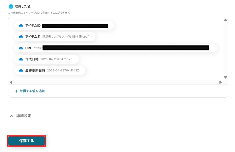 なお、最終更新日時は先ほど取得したOneDriveのアウトプットから選択します。