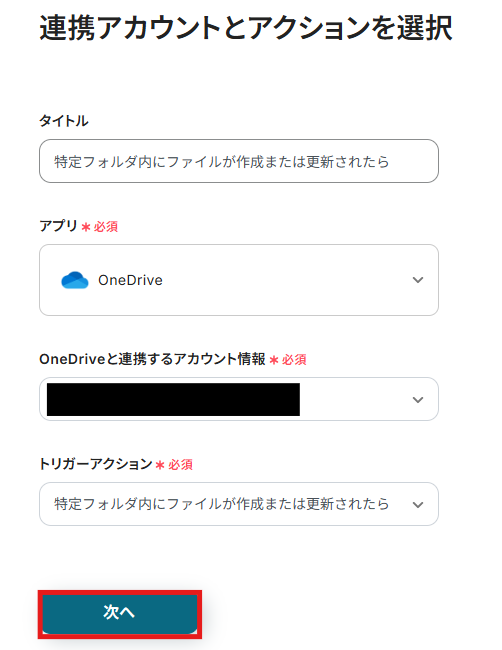 2) アクションは「特定フォルダ内にファイルが作成または更新されたら」が選択されていることを確認して、「次へ」をクリックします。