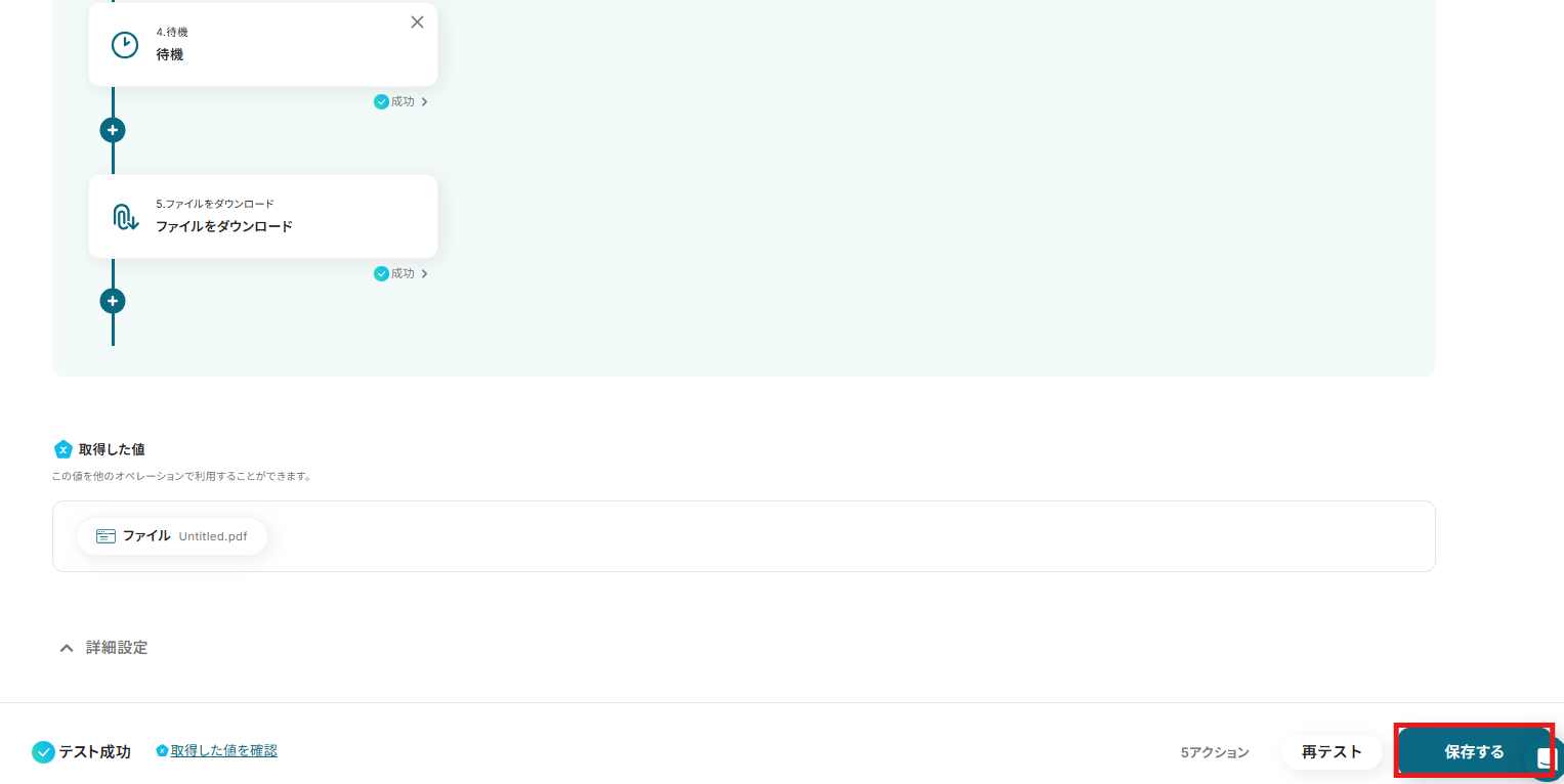 テストが成功すると、一番最後の項目がアウトプットとして反映されます。問題点がなければ、「保存」します。