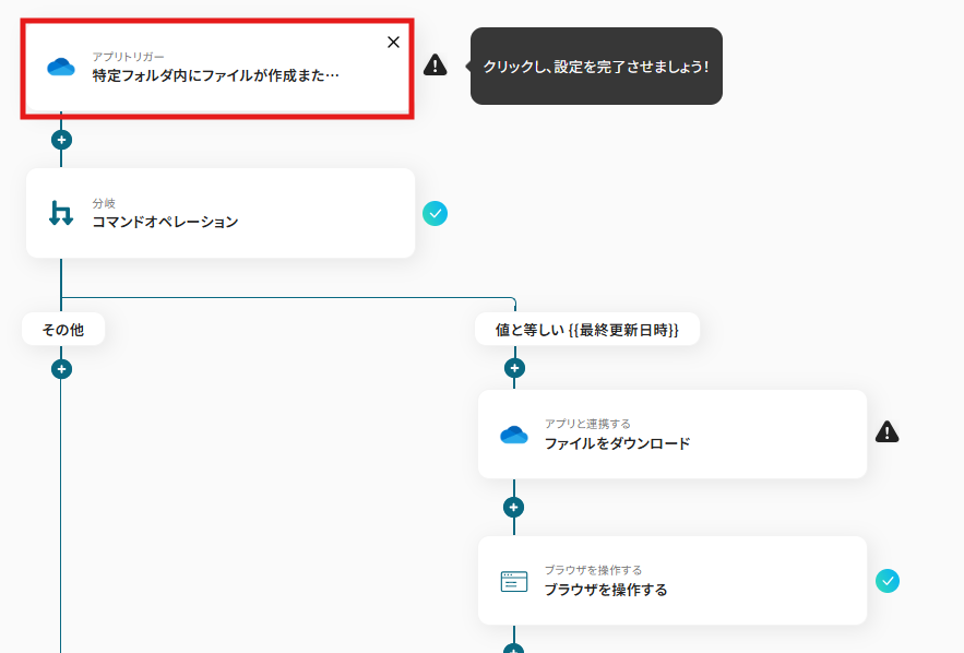 1)まずは「アプリと連携する 特定フォルダ内にファイルが作成または更新されたら」をクリックしてみましょう!