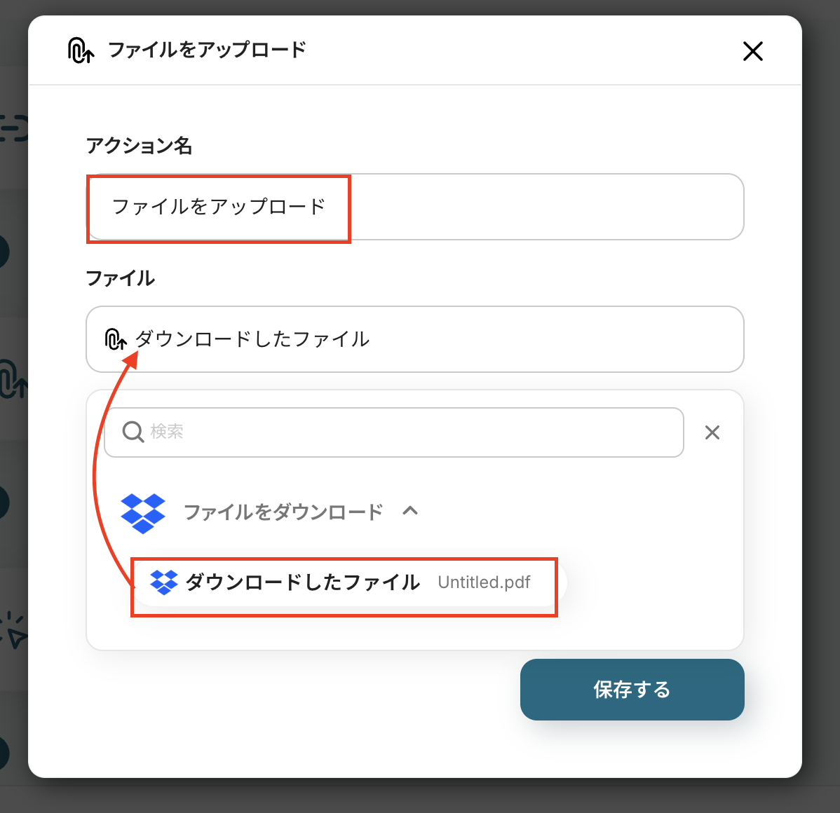 アクション名と設定し、ファイルにはDropboxのファイルをアップロードで取得した値から「ダウンロードしたファイル」を選択してください。