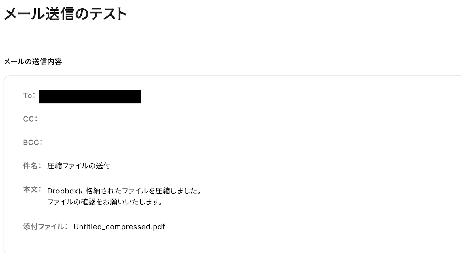 メールの内容や送信先、添付ファイルがブラウザを操作するのアクションで圧縮したPDFファイルになっているか確認し、テストをクリックします。
