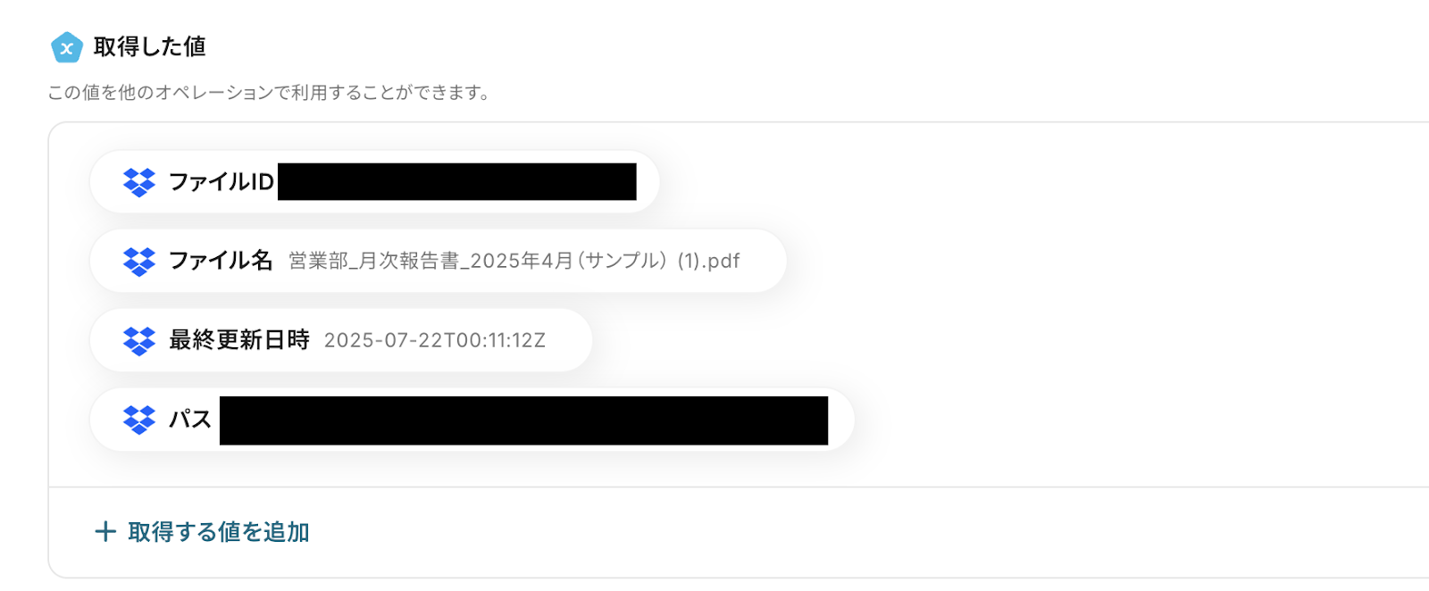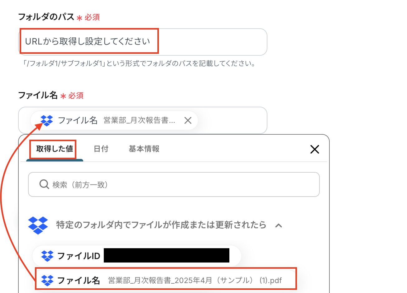 - ファイル名はDropboxのトリガーの取得した値から「ファイル名」を選択してください。