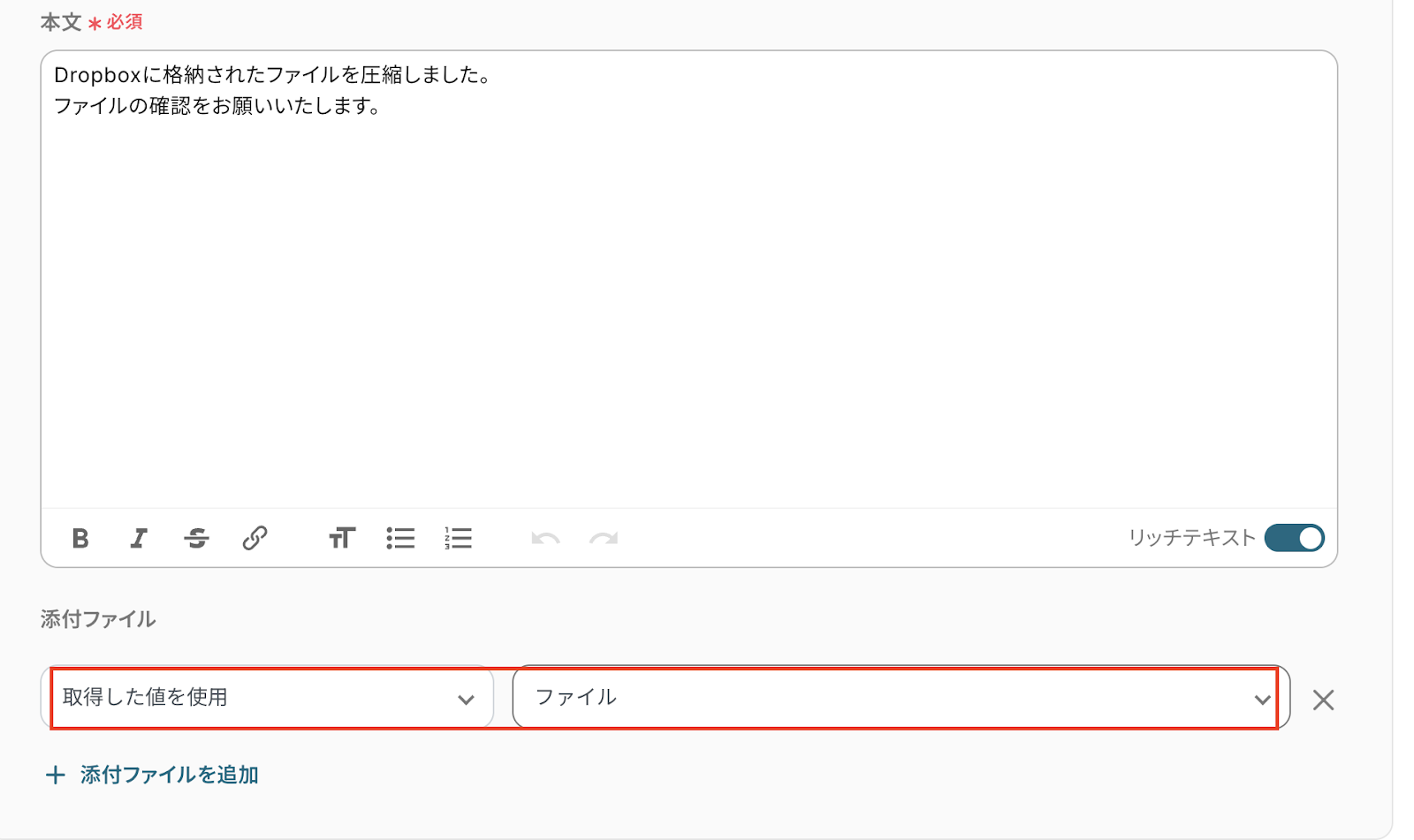 添付ファイルは、「取得した値を使用」、「ファイル」を設定し、次へをクリックしましょう。