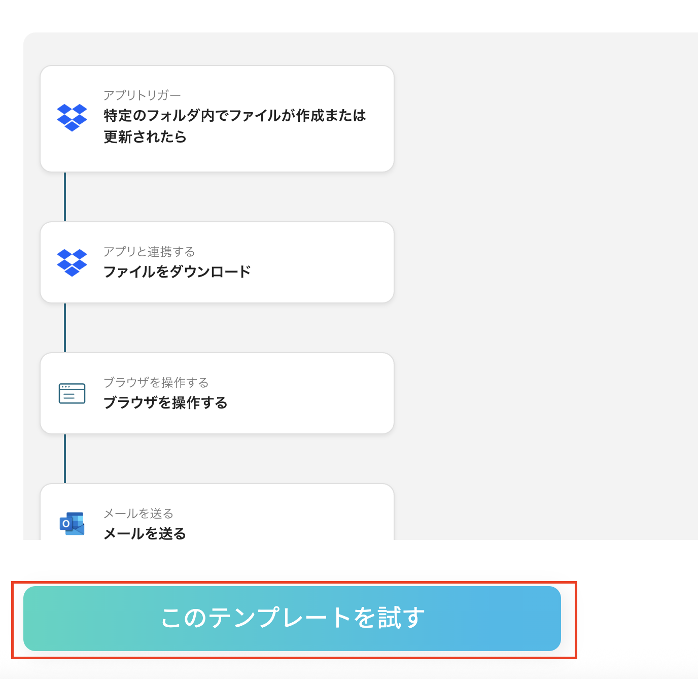 それではここから代表的な例として、DropboxにPDFファイルが格納された際に、RPAで自動的にファイルを圧縮し、Outlookで送信するフローを解説していきます!