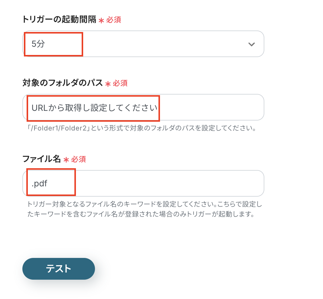 ファイル名はトリガーとなるファイル名のキーワードを設定してください。