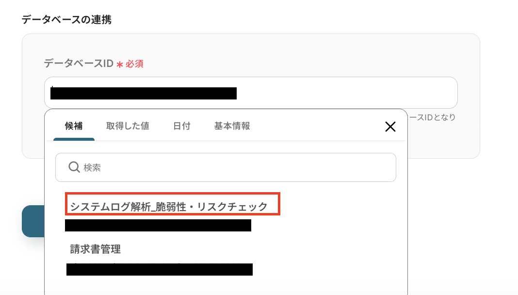入力欄をクリックすると連携しているアカウントに紐づいて候補が表示されるので、候補から該当のデータベースを選択してくださいね!
