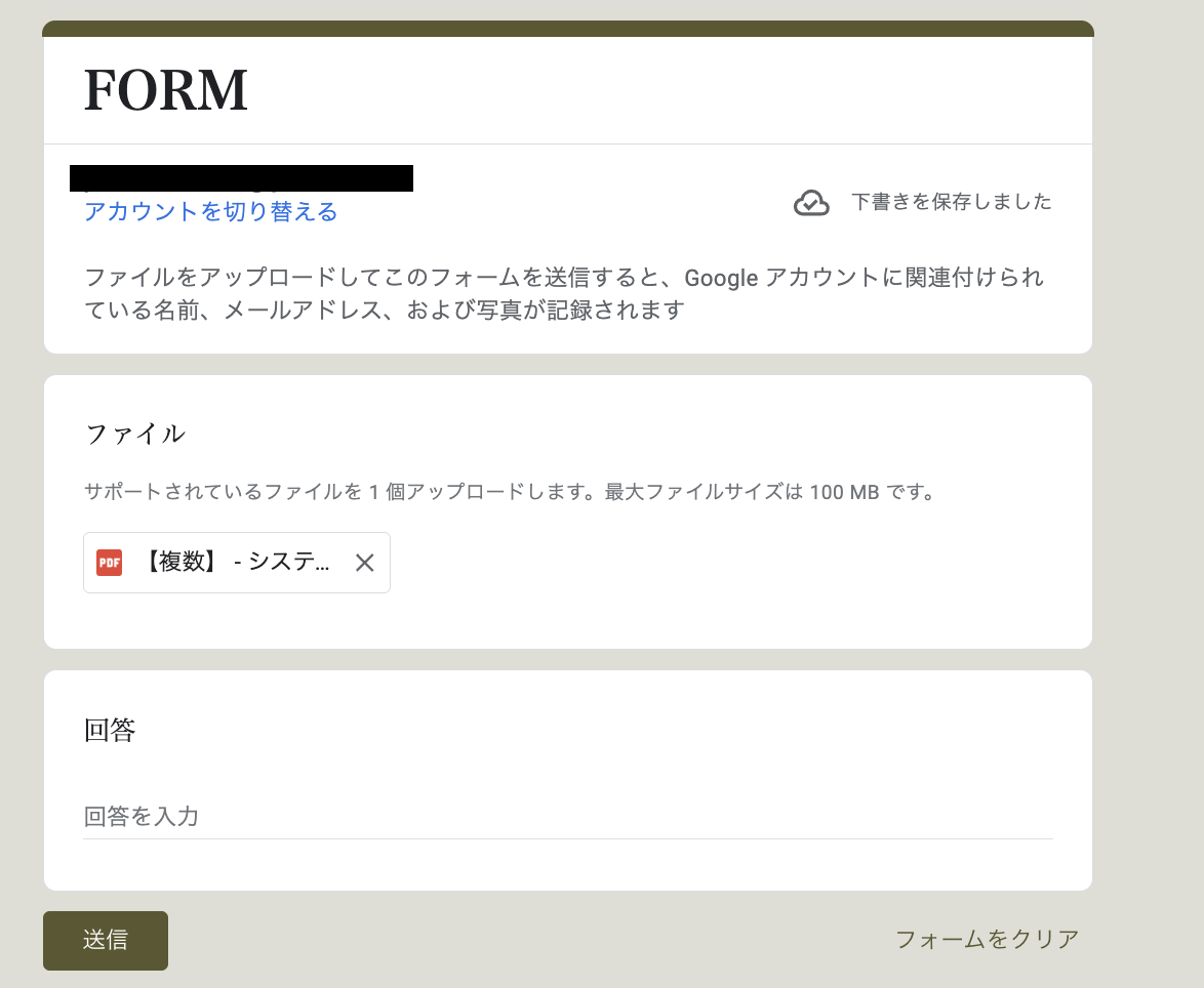 先ほど「フォームID」に設定したフォームに、テスト用に回答を送信してください。