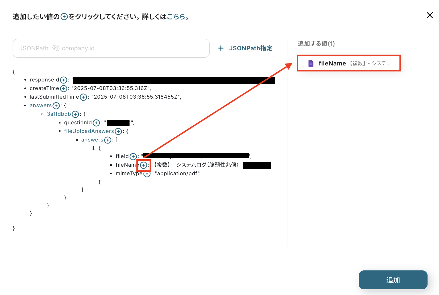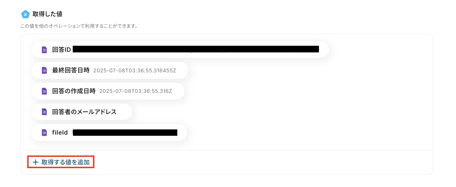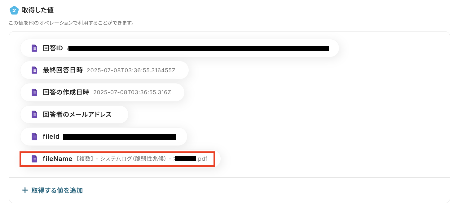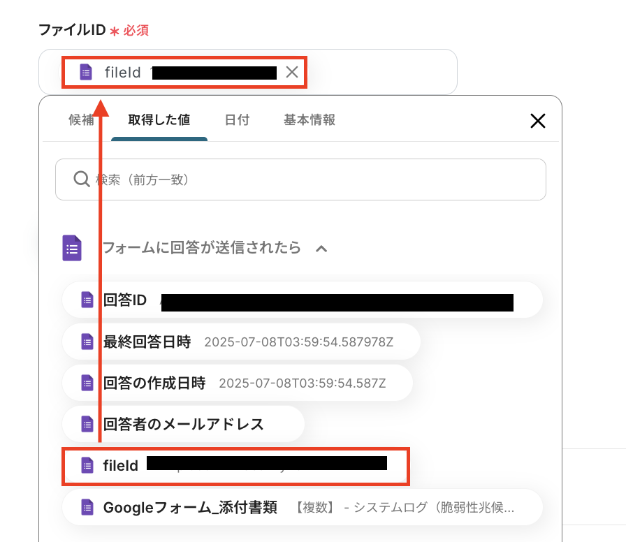 入力欄をクリックするとアウトプットを選択できるので、「取得した値」の「フォームに回答が送信されたら」内にある、「fileId」を選択してください。