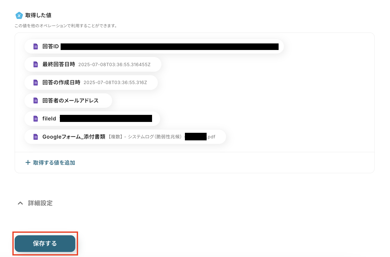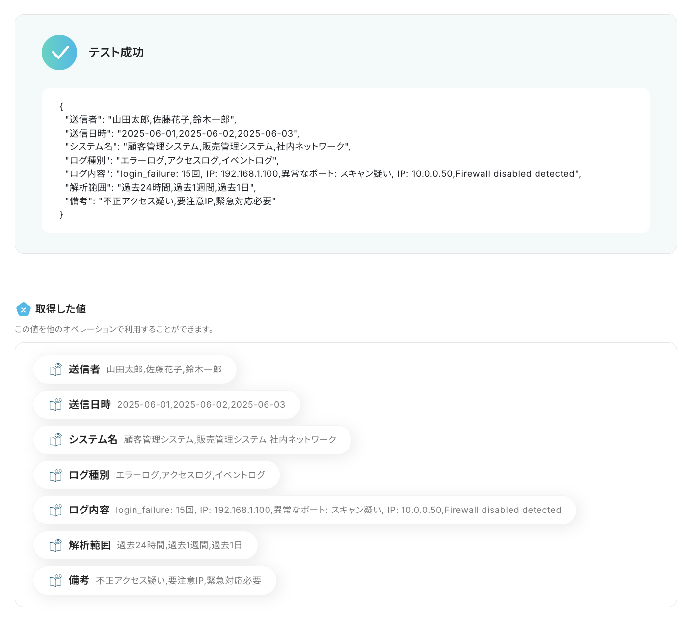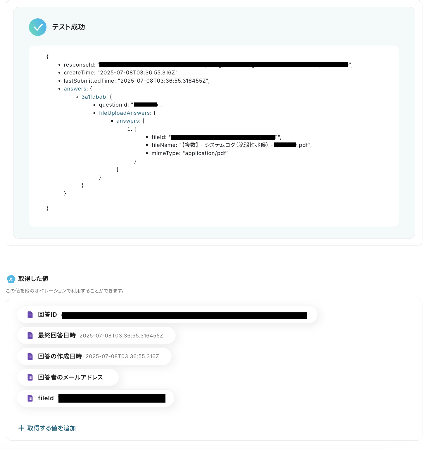 テストが成功すると、先ほど送信した回答データが「取得した値」にアウトプットとして抽出されるので、内容を確認しましょう。