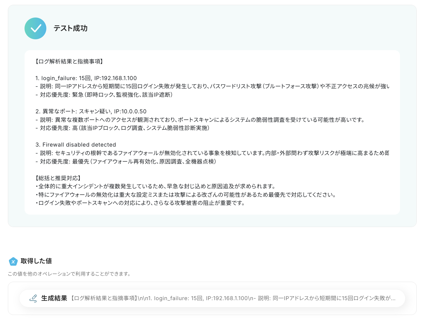 以上が、「Googleフォームでシステムログが送信された際に、AIがその内容から脆弱性の兆候を解析し、結果をNotionに自動で追加する」フローの作成手順でした!