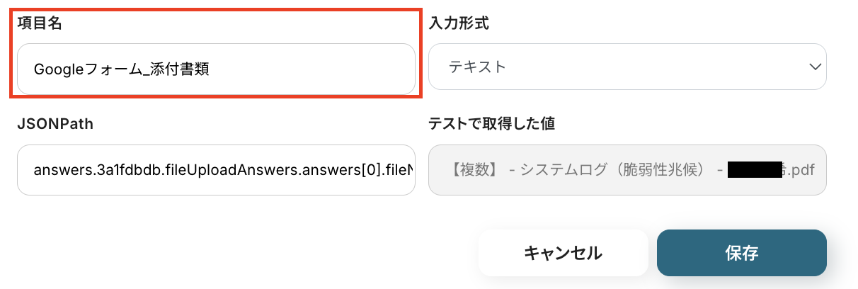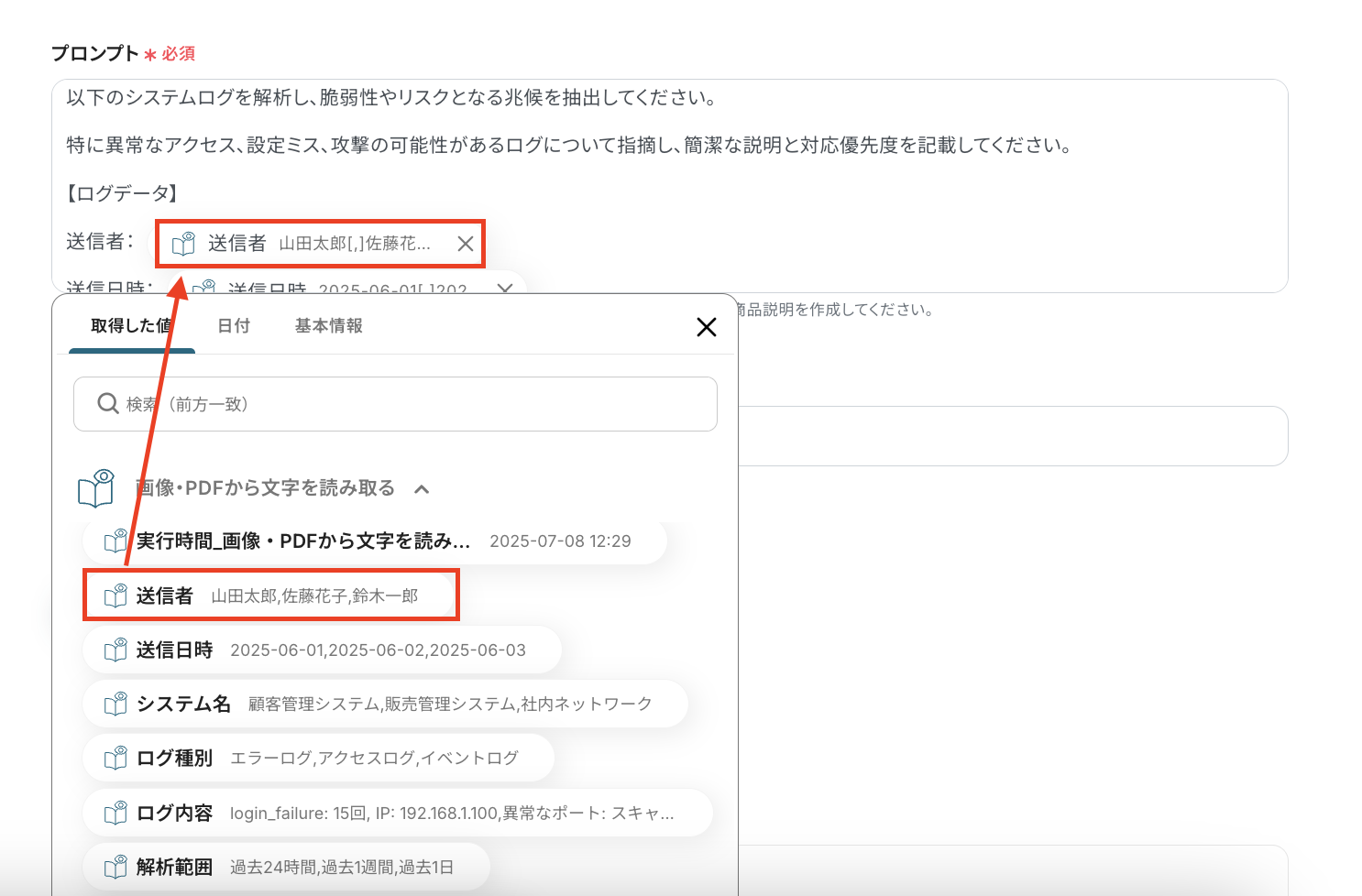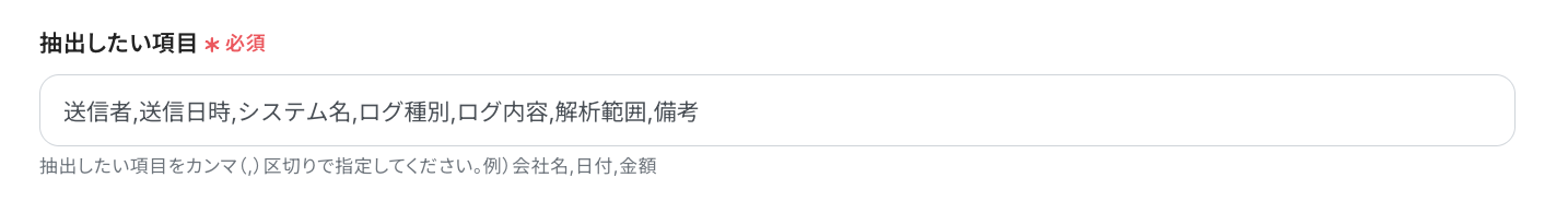 抽出したい項目:書類から抽出したいテキストデータの項目を設定します。「送信者」や「ログ内容」など、抽出したい項目をカンマ(,)区切りで入力してくださいね!