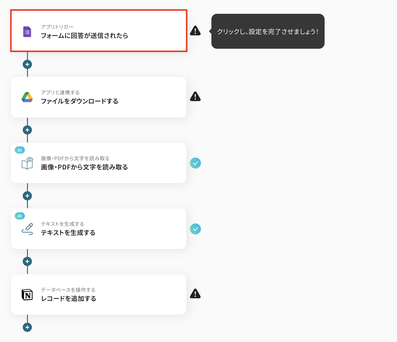 それではここから代表的な例として、「Googleフォームでシステムログが送信された際に、AIがその内容から脆弱性の兆候を解析し、結果をNotionに自動で追加する」フローの作成手順を解説していきます!
