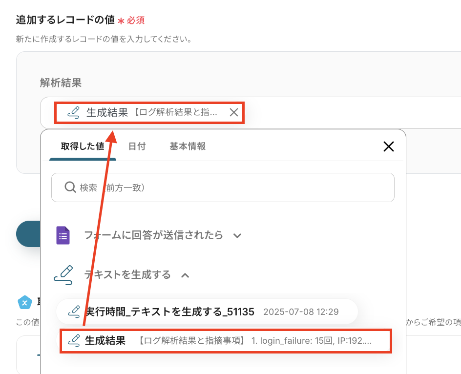 たとえば「解析結果」には、「取得した値」の「テキストを生成する」内にある「生成結果」を選択する、といった形に適切な値を選択しましょう。