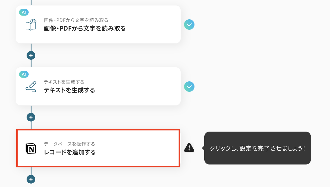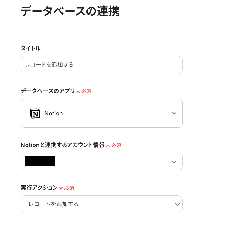 ※「追加するレコードの値」の各項目は、連携しているNotionデータベースに紐づいて表示されています。項目を編集したい場合は、Notionのデータベースを編集してください。