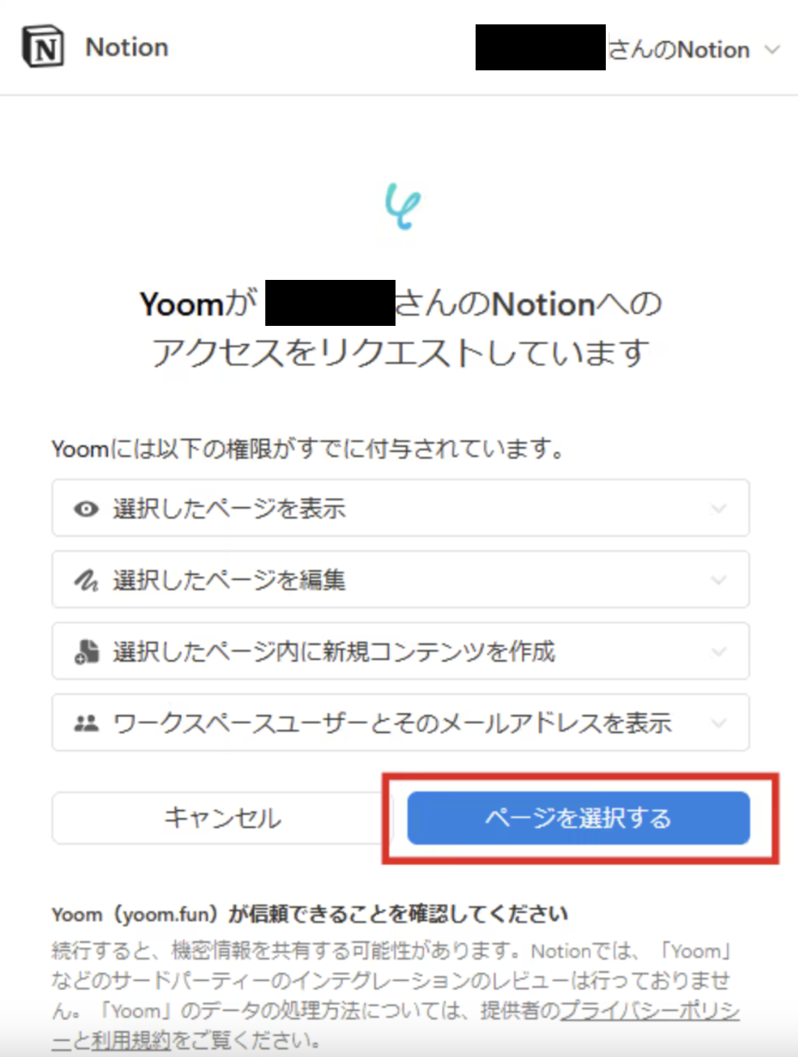 Yoomと連携するアカウントのログイン情報を入力し、「ページを選択する」をクリックしてください。