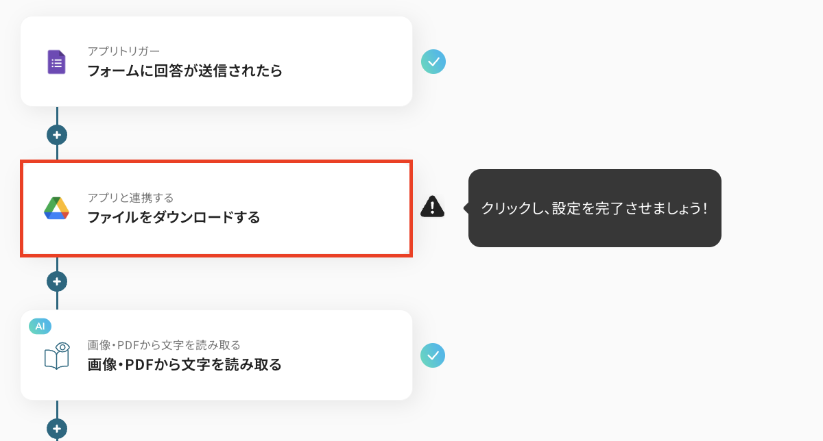 続いて、Googleフォームに回答された書類を、Google Driveからダウンロードする設定をしていきます。