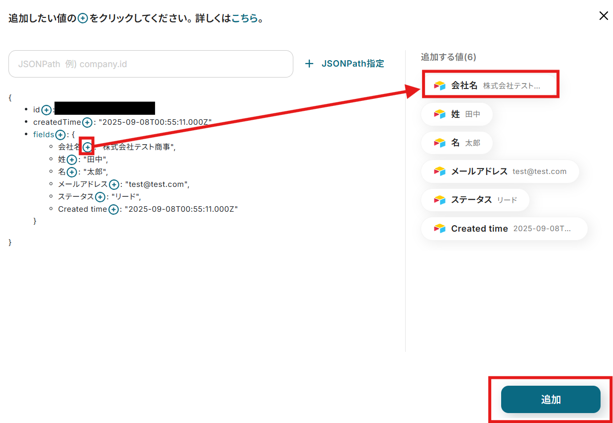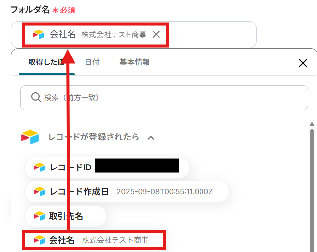 A:可能です!今回は例として{{会社名}}のみでフォルダ名を作成しましたが、複数のフィールド情報を使用できます。今回の例でいうと、「{{会社名}}_{{姓}}」と設定すれば、Boxに「株式会社テスト商事_田中」というフォルダの作成が可能です。