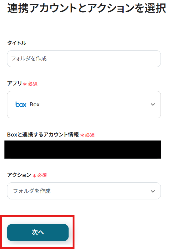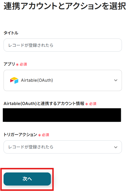 タイトルと連携するアカウント情報を確認し、アクションはテンプレート通りのまま「次へ」をクリックして進んでください。