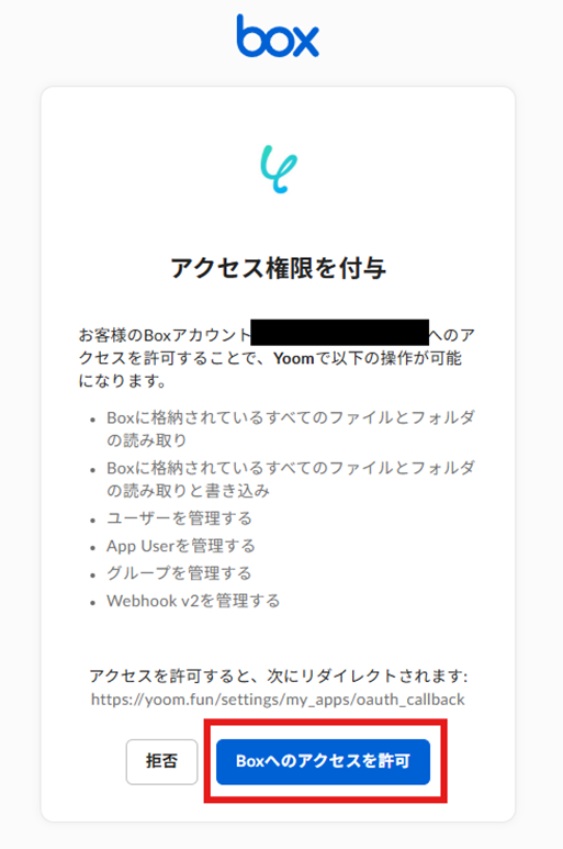 アクセス権限について確認して、「Boxへのアクセスを許可」しましょう。