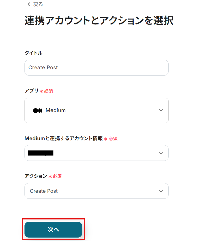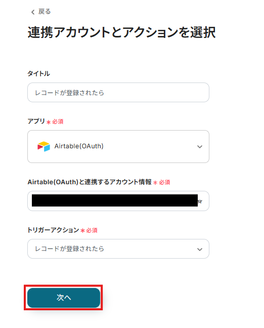 連携するアカウント情報には、ステップ1で連携したアカウント情報が反映されています。トリガーアクションはそのままにして、「次へ」をクリックしてください。