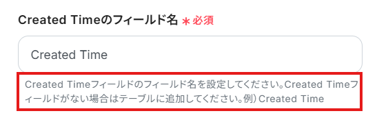 「Created Timeのフィールド名」は、入力欄下の注釈に沿って、入力してください。