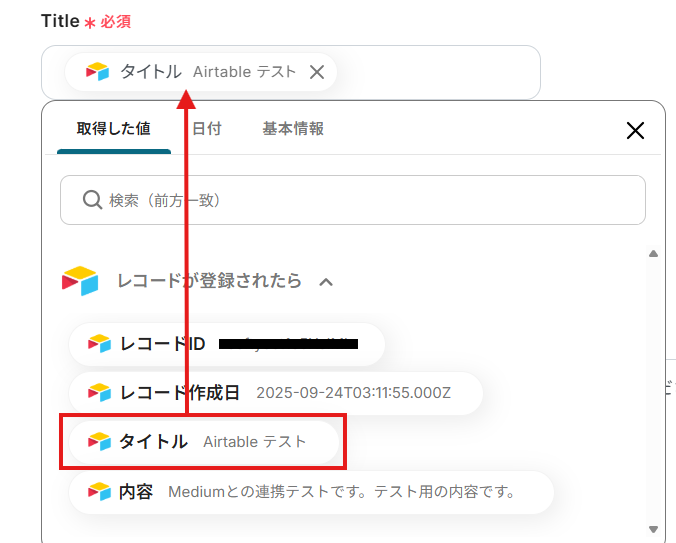 3.「Title」は、入力欄をクリックして表示される取得した値から選択してください。
