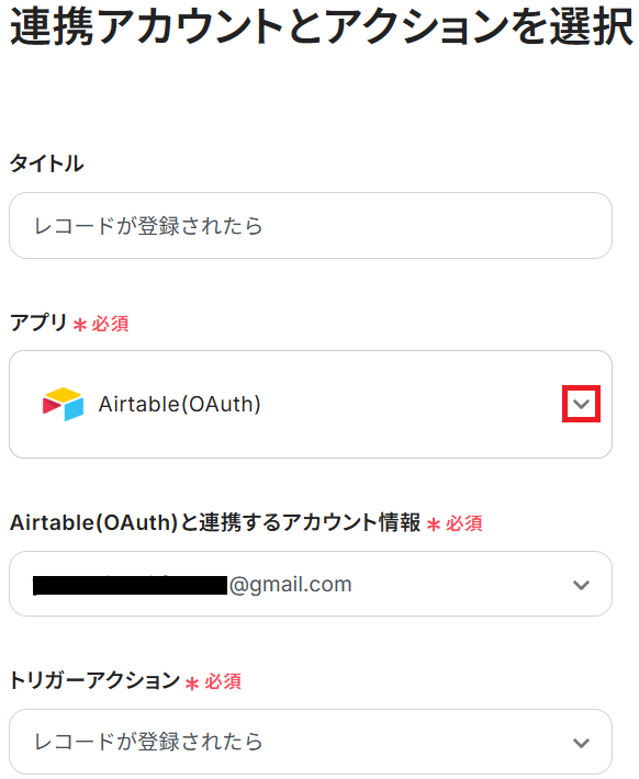 タイトルと連携するアカウント情報を任意で設定し、トリガーアクションはテンプレート通りに「レコードが登録されたら」のまま「次へ」をクリックします。