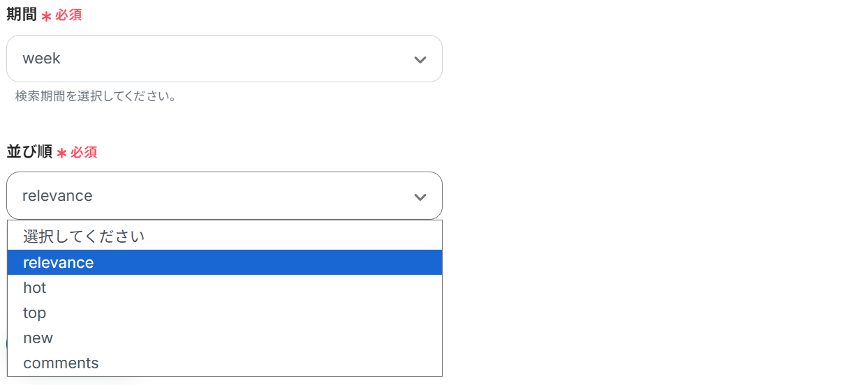 今回は、キーワードと関連性の高い投稿を優先するため関連度順にしました。