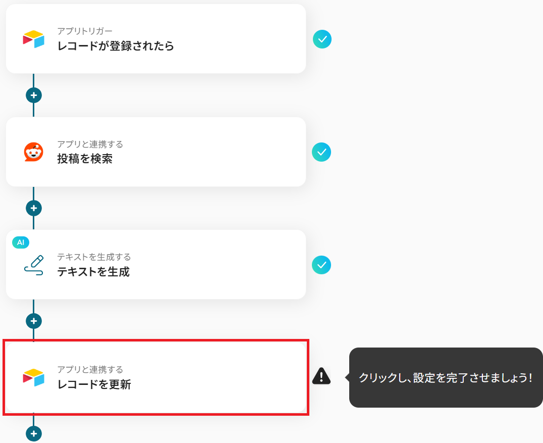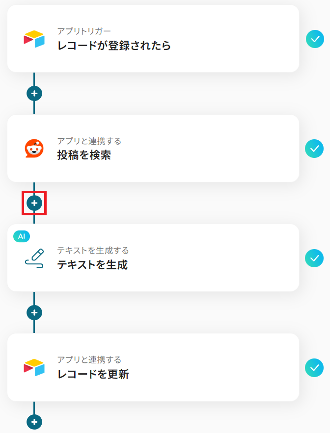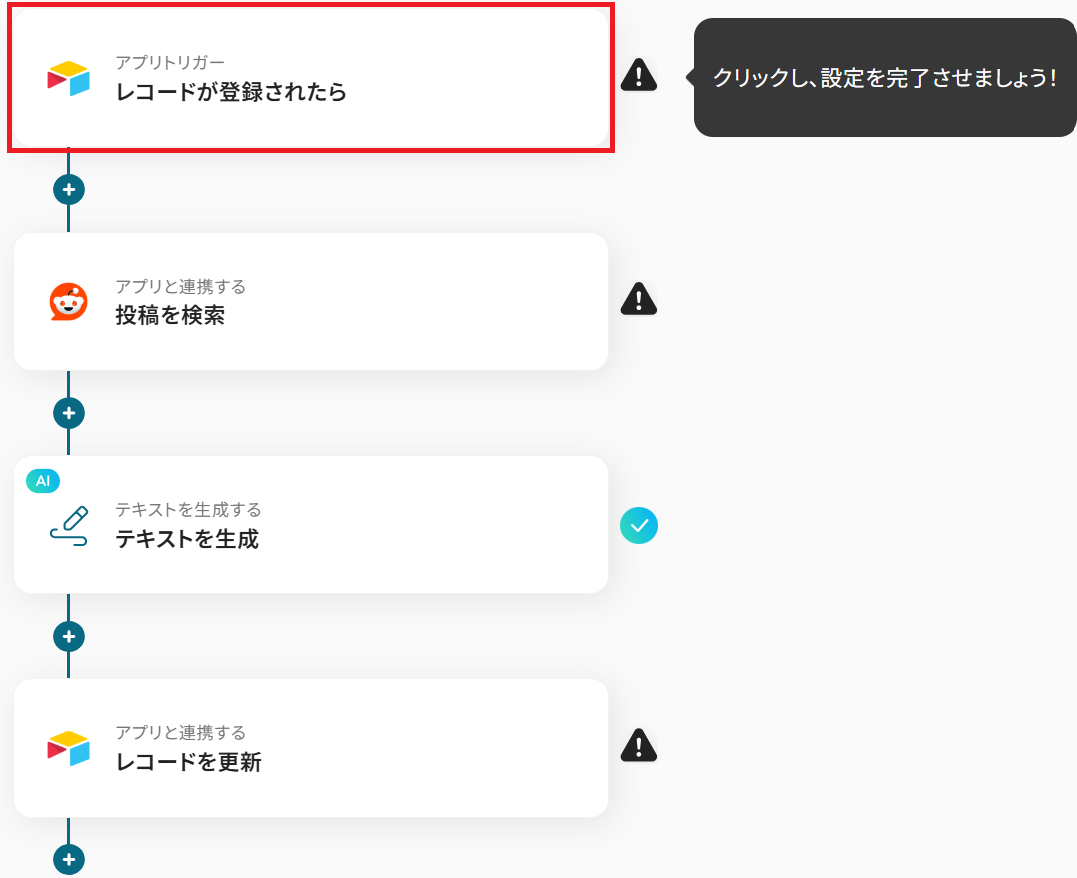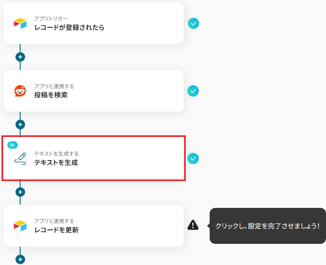 - Airtableのトリガー設定、Redditのアクション設定、テキストを生成する設定、Airtableのアクション設定