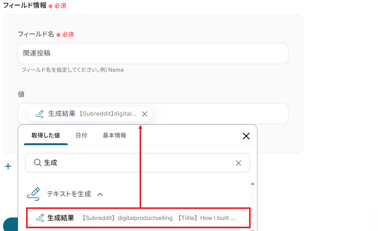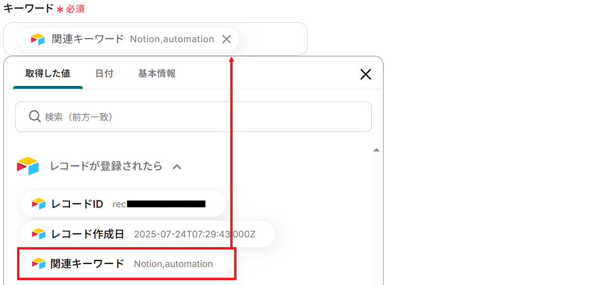 キーワードの欄にはAirtableから取得した「関連キーワード」の値が予め設定されているので、そのままで大丈夫です。