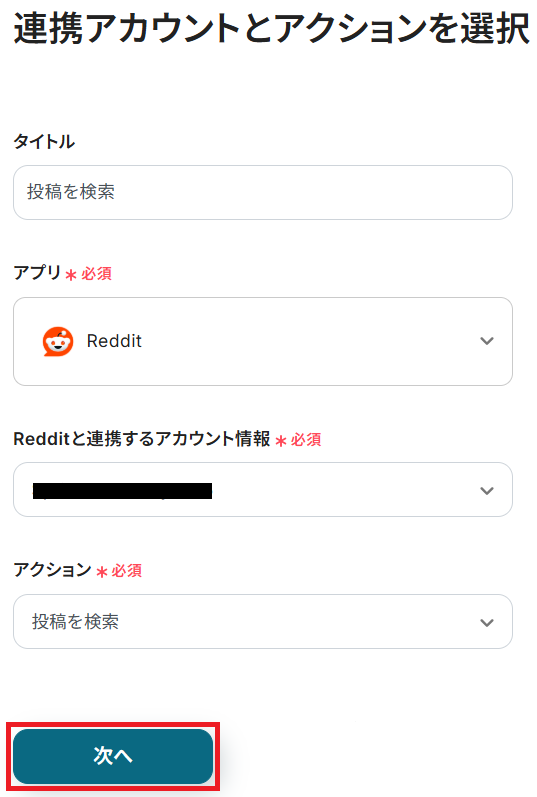 ステップ3と同様、アクションは「投稿を検索」のまま「次へ」をクリック。