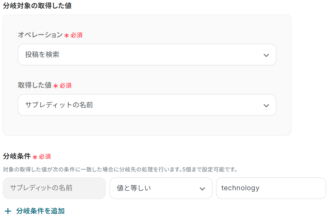 A:分岐設定を追加してください。分岐条件を「サブレディットの名前が〇〇(サブレディット名)と等しい場合」に設定することで、特定のサブレディットのみを対象とすることができます。