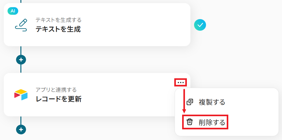 Airtableのアクションを削除し、代わりにGoogle スプレッドシートの「レコードを追加する」アクションを追加する。
