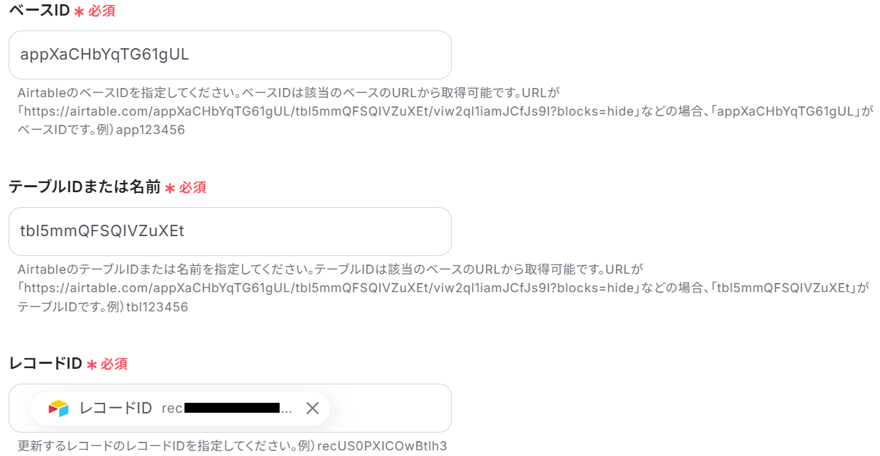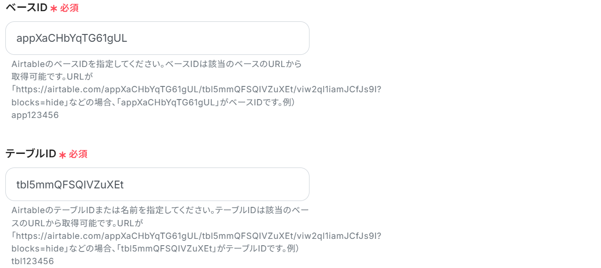 次に、テキストボックス下部の説明通りにベースIDとテーブルIDを入力してください。