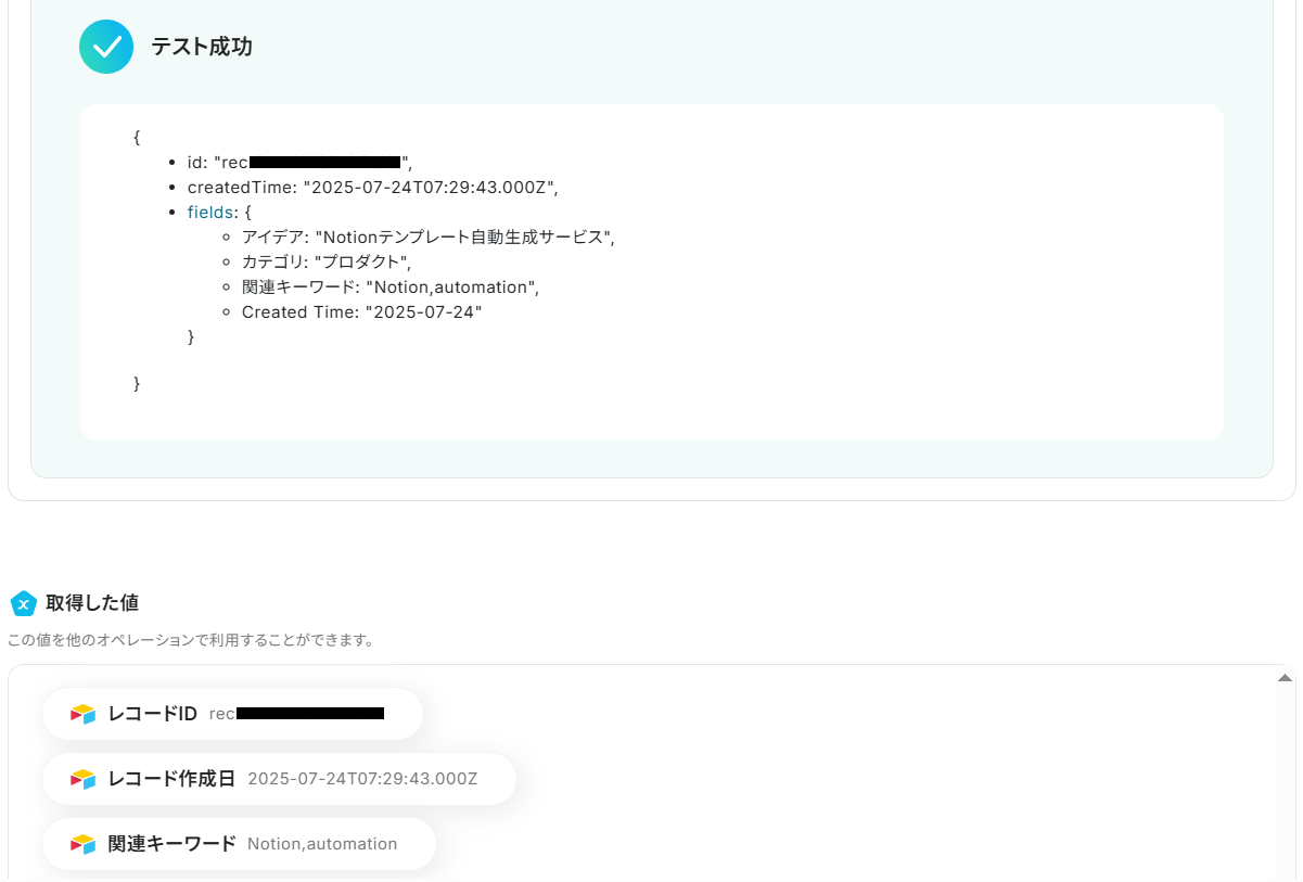 成功したら保存してください。ここで取得した値を次以降のステップで活用します。