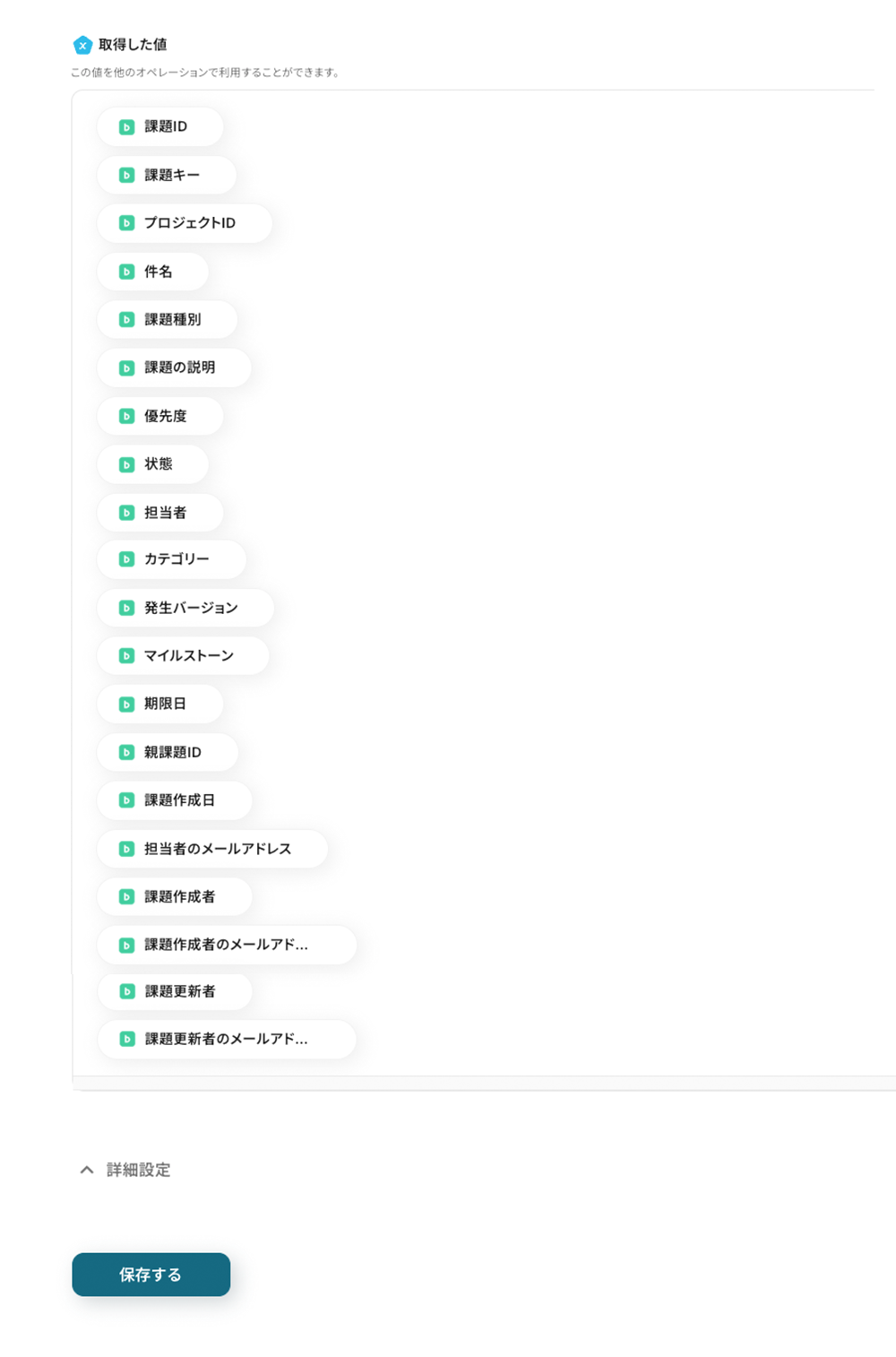 成功すると、追加した課題の情報から抽出できる値が表示されます。