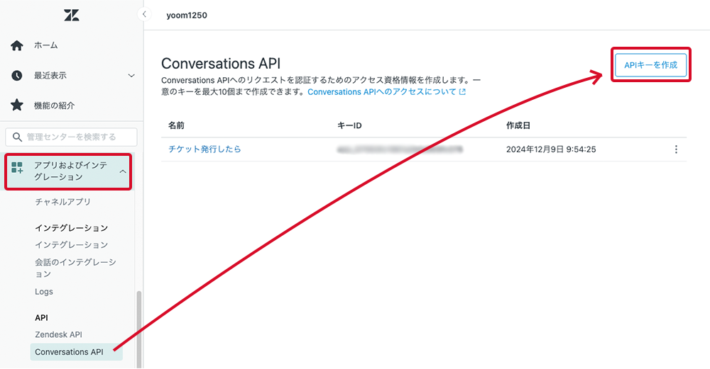 - 左のメニューバーの「アプリおよびインテグレーション」をプルダウンで開き、API直下の「conversations API」を選択し、右上の「APIキーを作成」をクリックします。
