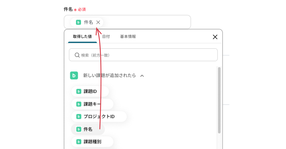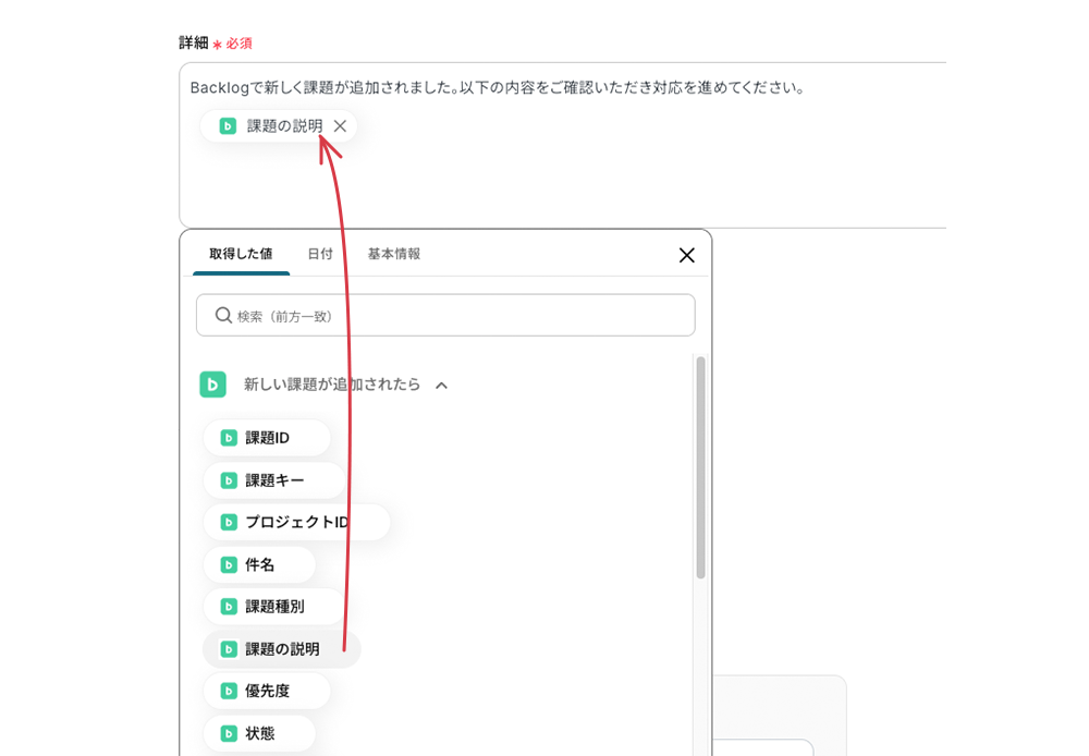 - Backlogで取得した件名の引用コードを埋め込みます。フィールドをクリックすると表示されるプルダウンメニューの中から選択可能です。