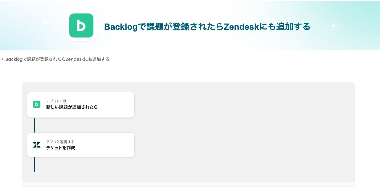 「Backlogで特定の課題が登録されたら、Zendeskにもチケットを自動追加する」フローは、運用の手間を減らす業務ワークフローです。