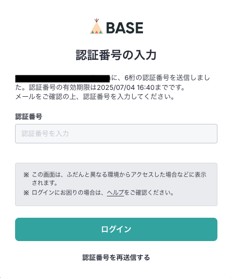 ログイン時に入力したメールアドレスに届いた認証コードを入力し、「ログイン」をクリックします。