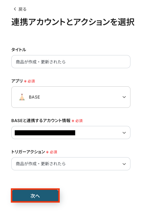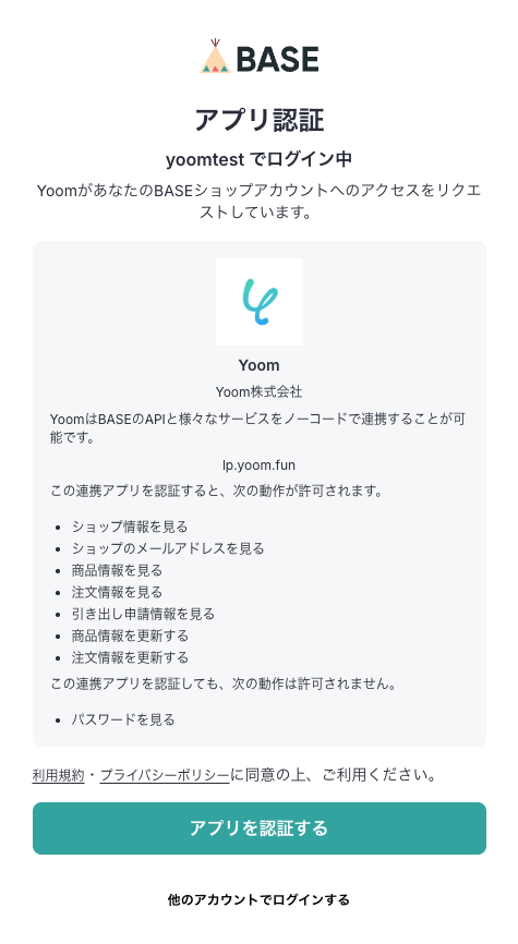 BASEと連携するアカウント情報に問題がなければ、「次へ」をクリックします。
